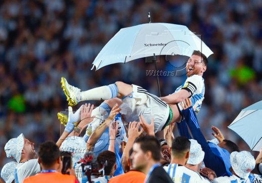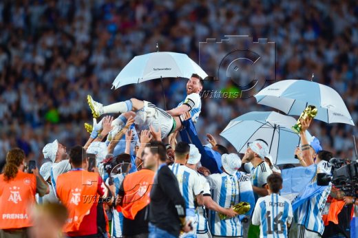Lionel Messi (Argentinien) auf den Schultern von Mitspielern und Fans, Feier zum WM-Sieg 2022