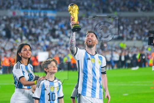 Lionel Messi (Argentinien) mit Ehefrau Antonella Roccuzzo, Sohn Thiago und WM-Pokal, Feier zum WM-Sieg 2022
