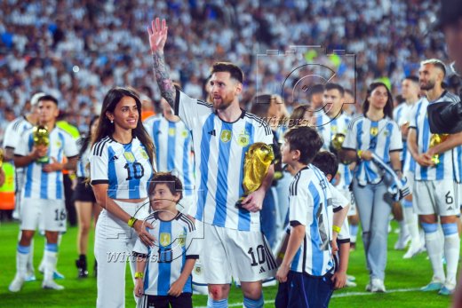 Lionel Messi (Argentinien) mit Ehefrau Antonella Roccuzzo, den Soehnen Ciro, Thiago und Matteo sowie dem WM-Pokal, Feier zum WM-Sieg 2022