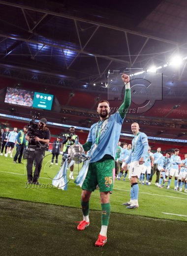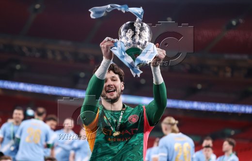 Manchester City League-Cup-Sieger 2026, Torwart James Trafford mit Pokal