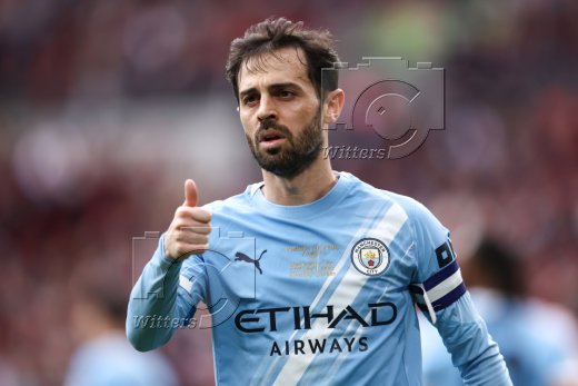 Manchester City League-Cup-Sieger 2026, v.l. Bernardo Silva mit Pokal, Rodri, Nathan Ake