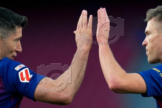 2:1 Tor, Jubel, v.l. Robert Lewandowski, Torschuetze Dani Olmo (Barcelona)