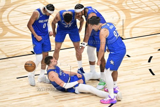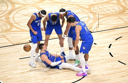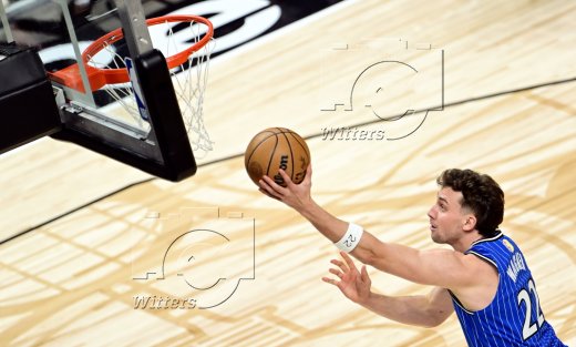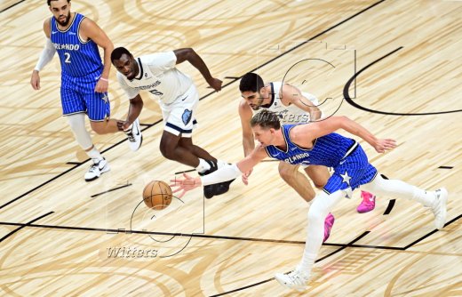 Moritz Wagner (Magic, am Boden), v.l. Anthony Black, Tristan da Silva, Paolo Banchero, Noah Penda
