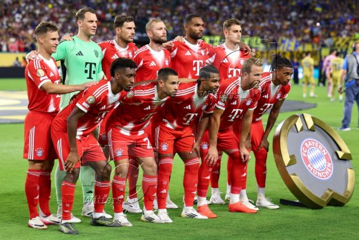 Team Bayern, hinten v.l. Joshua Kimmich, Torwart Manuel Neuer, Leon Goretzka, Konrad Laimer, Jonathan Tah, Josip Stanisic, vorn v.l. Kingsley Coman, Raphael Guerreiro, Serge Gnabry, Harry Kane, Michael Olise