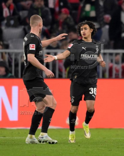 4:1 Tor, Jubel, v.l. Nicolas Jackson (Bayern), Fabio Chiarodia, Torschuetze Wael Mohya (Gladbach)