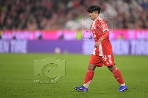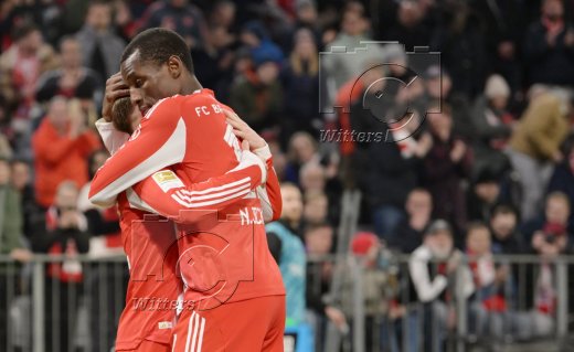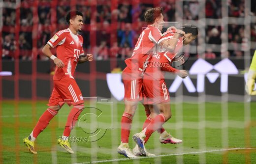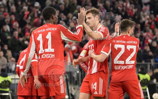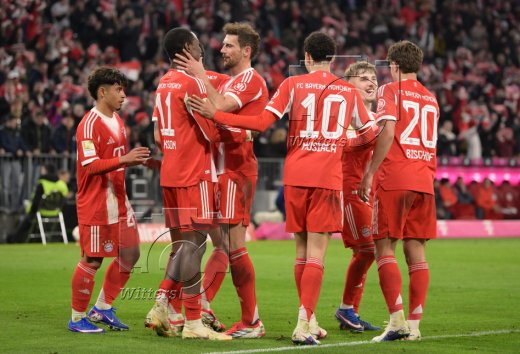 3:0 Tor, Jubel, v.l. Luis Diaz, Tom Bischof, Torschuetze Jamal Musiala (Bayern)