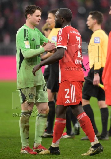 Schlussjubel, v.l. Torwart Jonas Urbig (Bayern), Dayot Upamecano