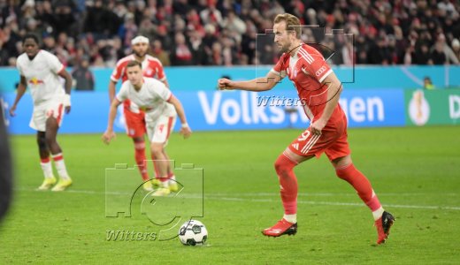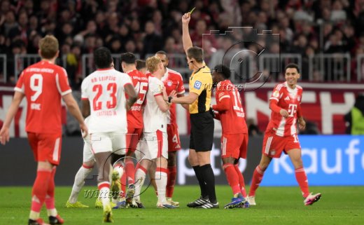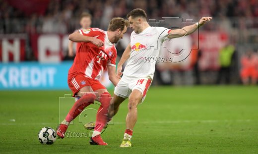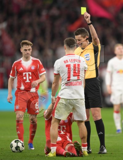 v.l. Harry Kane (Bayern), Christoph Baumgartner (Leipzig, gelbe Karte), Schiedsrichter Daniel Siebert