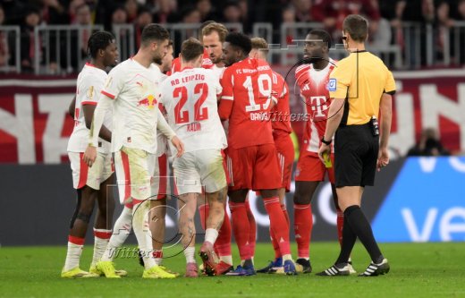 Streit v.l. Castello Lukeba, Romulo, David Raum (Leipzig), Harry Kane, Alphonso Davies, Joshua Kimmich, Dayot Upamecano (Bayern), Schiedsrichter Daniel Siebert