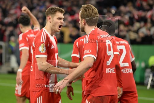 1:0 Tor, Jubel, v.l. Aleksandar Pavlovic, Torschuetze Harry Kane, Luis Diaz (Bayern)