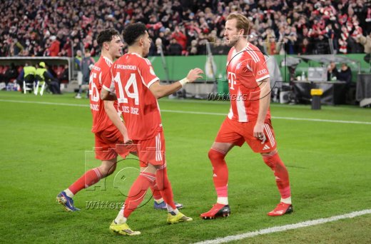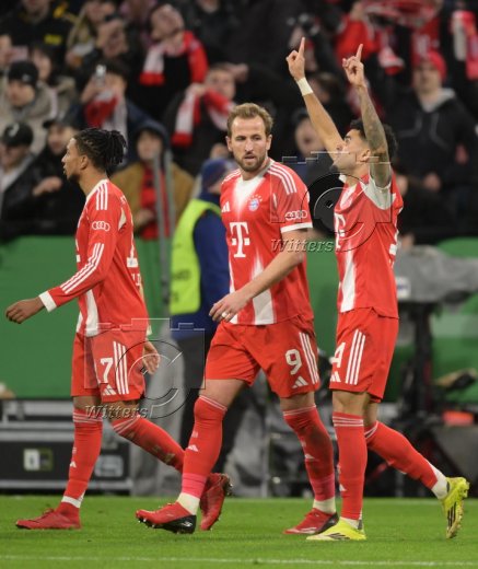 1:0 Tor, Jubel, v.l. Aleksandar Pavlovic, Luis Diaz, Torschuetze Harry Kane (Bayern)