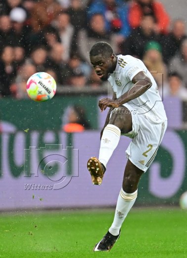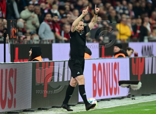Schiedsrichter Tobias Stieler gibt Elfmeter nach Videobeweis an nach Foul von Dayot Upamecano (Bayern) gegen Amine Adli (Leverkusen)