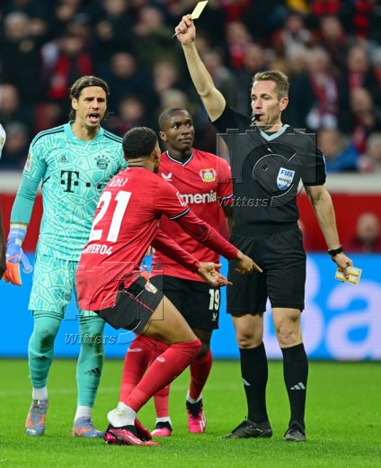 Schiedsrichter Tobias Stieler zeigt Amine Adli (Leverkusen) die gelbe Karte nach angeblicher Schwalbe, gelbe Karte wird nach Videobeweis annulliert und gibt Elfmeter, v.l.,Torwart Yann Sommer (Bayern), Moussa Diaby