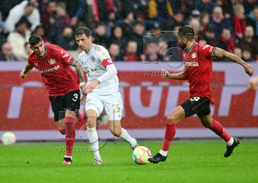 v.l. Piero Hincapie, Thomas Mueller (Bayern), Kerem Demirbay