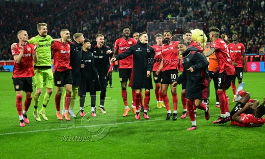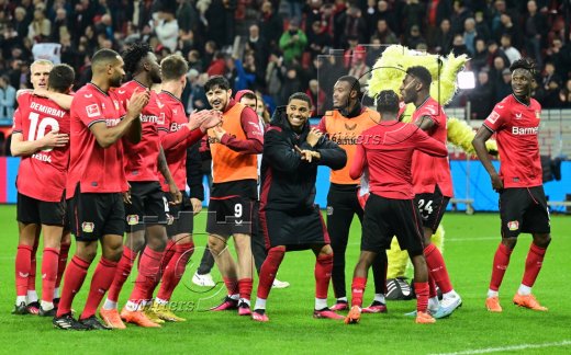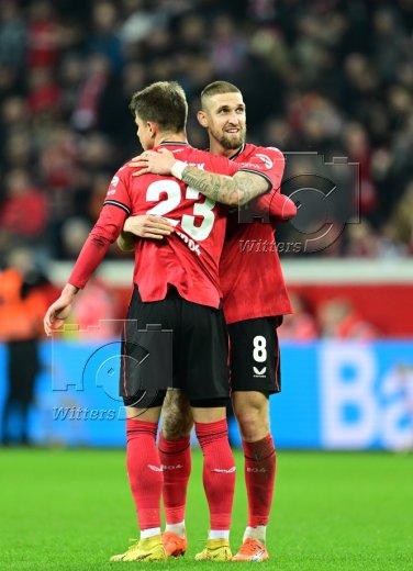 Schlussjubel v.l. Adam Hlozek, Robert Andrich (Leverkusen)