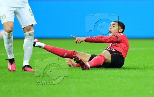 Szene nach dem Foul zum Elfmeter v.l. Benjamin Pavard, Amine Adli (Leverkusen)