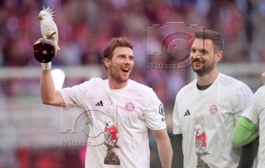FC Bayern Muenchen, Deutscher Meister 2026 v.l. Leon Goretzka mit Porzellan-Kakadu, Torwart Sven Ulreich