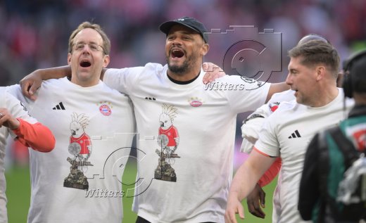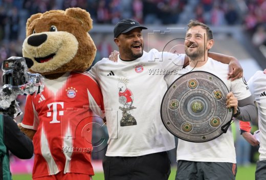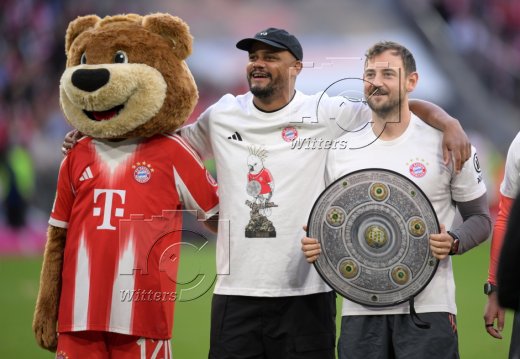 FC Bayern Muenchen, Deutscher Meister 2026 v.l. Maskottchen Berni, Trainer Vincent Kompany, Co-Trainer Rene Maric mit Papp-Meisterschale