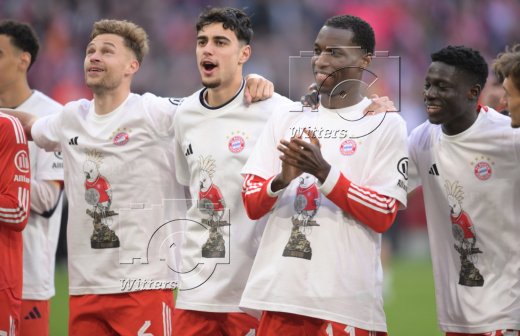 FC Bayern Muenchen, Deutscher Meister 2026 v.l. Joshua Kimmich, Aleksandar Pavlovic, Nicolas Jackson, Bara Sapoko Ndiaye