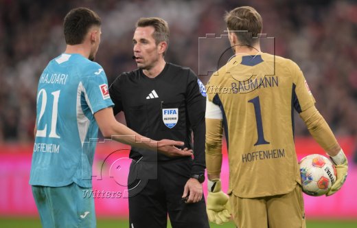 v.l. Albian Hajdari, Schiedsrichter Tobias Stieler, Torwart Oliver Baumann (Hoffenheim)