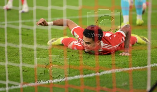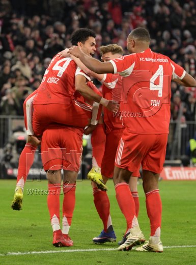 4:1 Tor, Jubel, v.l. Aleksandar Pavlovic, Torschuetze Luis Diaz, Harry Kane, Jonathan Tah, Michael Olise, Joshua Kimmich, Serge Gnabry, Dayot Upamecano (Bayern)