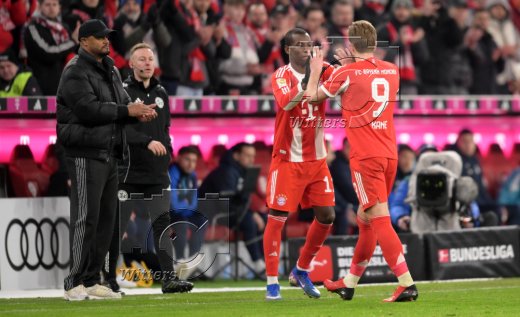 v.l. Trainer Vincent Kompany (Bayern), Nicolas Jackson, Harry Kane