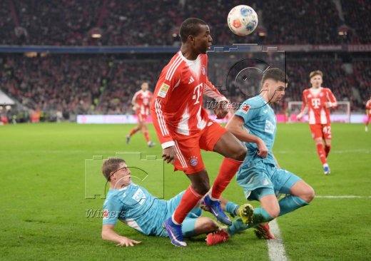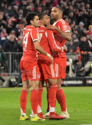 4:1 Tor, Jubel, v.l. Torschuetze Luis Diaz, Michael Olise, Jonathan Tah (Bayern)