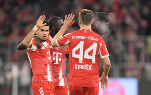 5:1 Tor, Jubel, v.l. Torschuetze Luis Diaz, Dayot Upamecano, Josip Stanisic (Bayern)