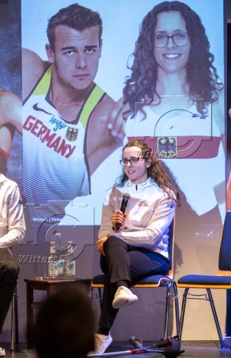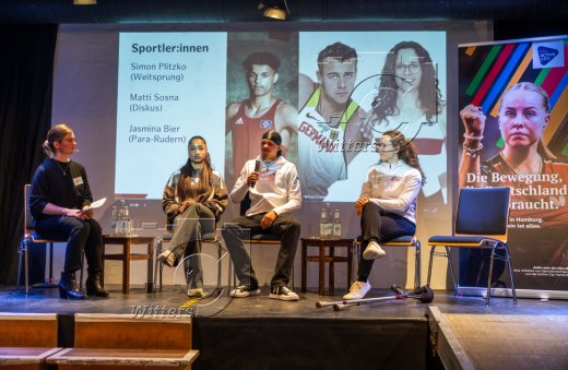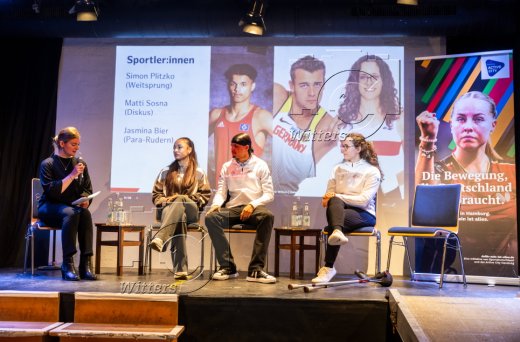 v.l. Moderatorin Sophie May, Josie Krone (Leichtathletik Weitsprung, TSG Bergedorf), Simon Plitzko (Weitsprung, TSG Bergedorf), Jasmin Bier (Para-Rudern)