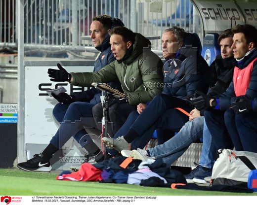 v.l. Torwarttrainer Frederik Goessling, Trainer Julian Nagelsmann, Co-Trainer Xaver Zembrod (Leipzig)