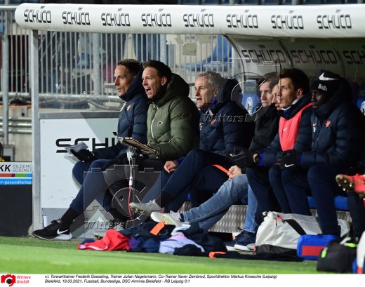 v.l. Torwarttrainer Frederik Goessling, Trainer Julian Nagelsmann, Co-Trainer Xaver Zembrod, Sportdirektor Markus Kroesche (Leipzig)