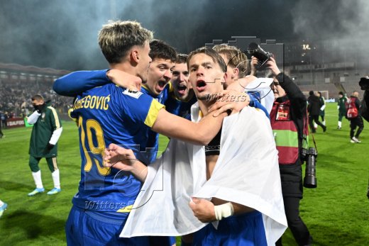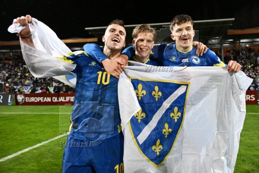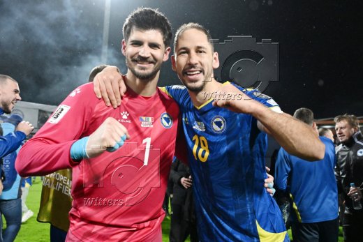 Schlussjubel, v.l. Torwart Nikola Vasilj (Bosnien), Nikola Katic