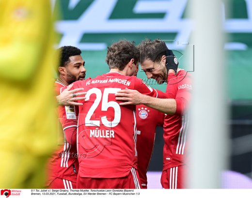 0:2 Tor, Jubel v.l. Lucas Hernandez, Torschuetze Serge Gnabry (Bayern), Christian Gross (Bremen)