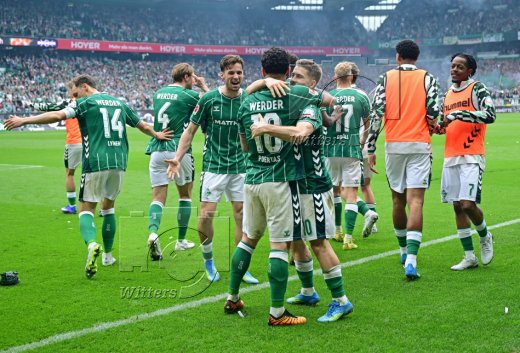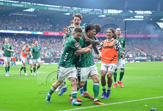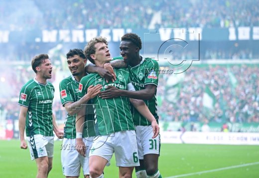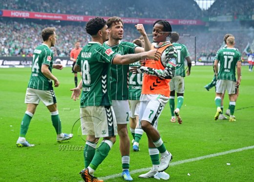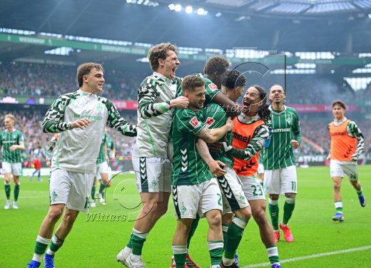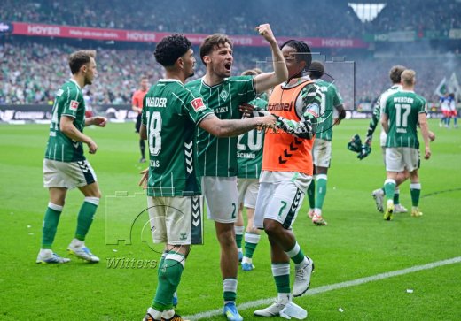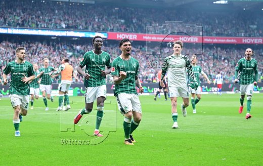 3:1 Tor, Jubel Werder v.l. Romano Schmid, Jens Stage, Torschuetze Cameron Puertas, Karim Coulibaly, Isaac Schmidt, Justin Njinmah