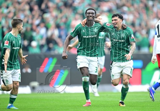 3:1 Jubel Werder v.l. Romano Schmid, Karim Coulibaly, Torschuetze Cameron Puertas (Bremen)