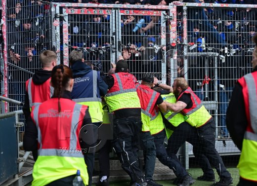 Ordner druecken das Sicherheitstor im HSV Fanblock wieder zu, nachdem Fans auf das Spielfeld laufen wollten