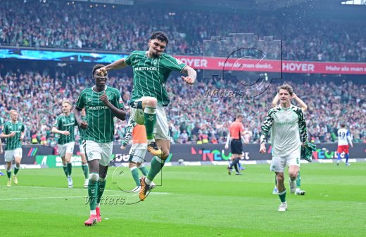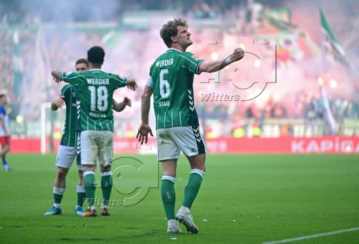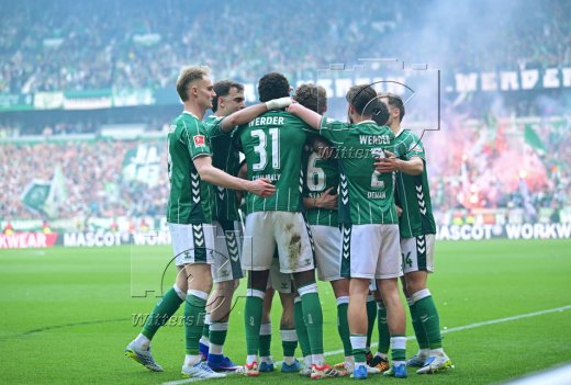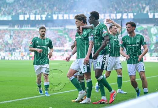 2:1 Tor, Jubel Werder v.l. Amos Pieper, Jovan Milosevic, Karim Coulibaly, Torschuetze Jens Stage, Olivier Deman