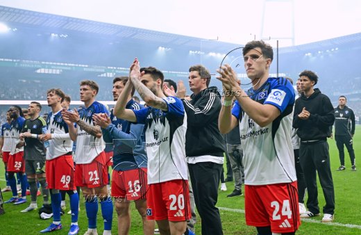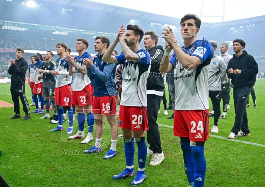 HSV v.l. Luka Vuskovic, Jordan Torunarigha, Torwart Daniel Heuer Fernandes (HSV), Otto Stange, Nicolai Remberg, Giorgi Gocholeishvili, Fabio Vieira, Trainer Merlin Polzin (HSV), Nicolas Capaldo, Alexander Roessing-Lelesiit , nach Schlusspfiff