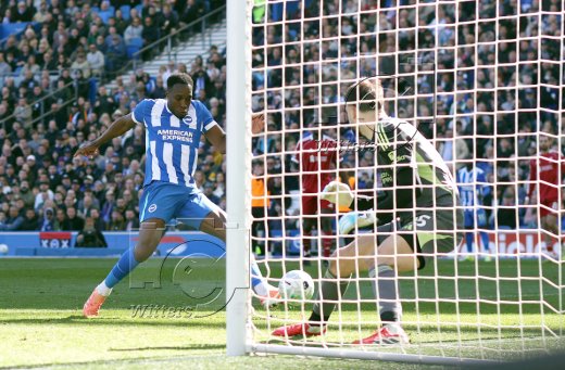 2:1 Tor, v.l. Torschuetze Danny Welbeck (Brighton), Torwart Giorgi Mamardashvili (Liverpool)