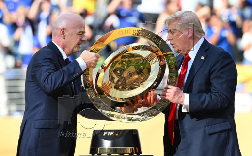 FC Chelsea London, Sieger Klub-WM 2025 v.l. FIFA-Praesident Gianni Infantino, US-Praesident Donald Trump