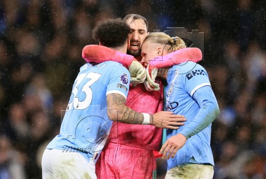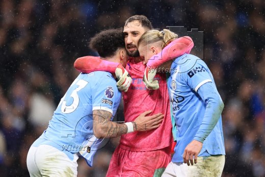Schlussjubel, v.l. Nico O'Reilly, Torwart Gianluigi Donnarumma, Erling Haaland (Manchester)