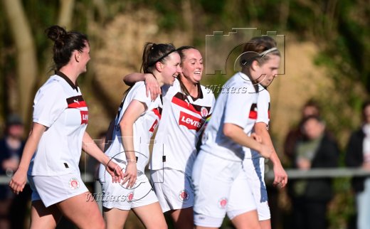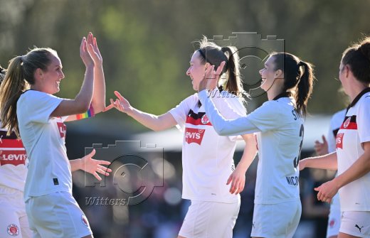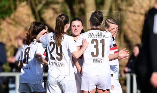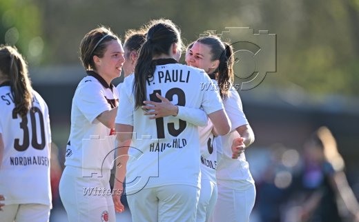 0:2 Tor, Jubel, v.l. Rachel Rinast, Torschuetzin Julia Hechtenberg (St. Pauli), Annie Kingman, Carlotta Kuhnert