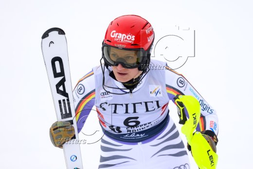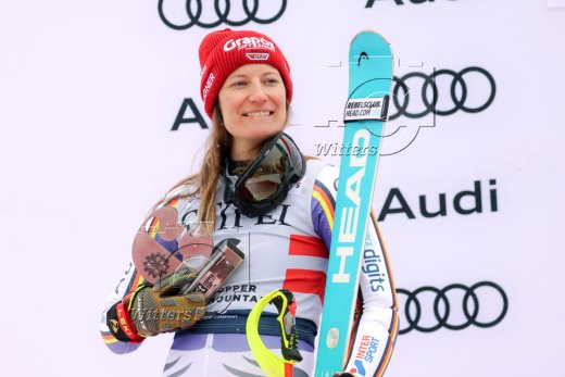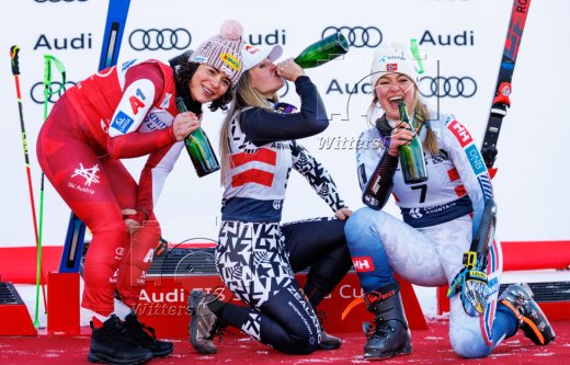 v.l. Lena Duerr (Deutschland, 2. Platz), Siegerin Mikaela Shiffrin (USA), Lara Colturi (Albanien, 3. Platz)