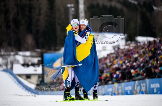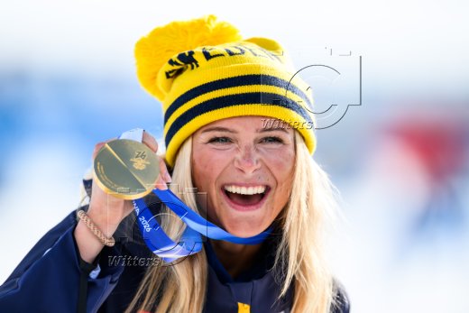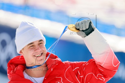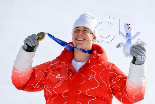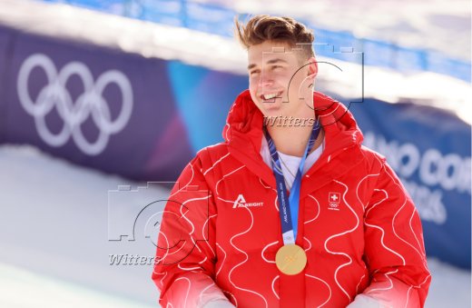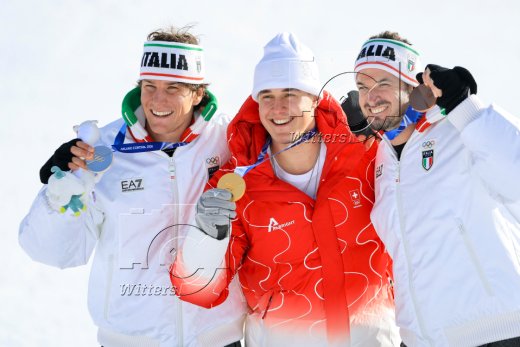 v.l. Giovanni Franzoni (Italien, Silber), Olympiasieger Franjo von Allmen (Schweiz), Dominik Paris (Italien, Bronze)
