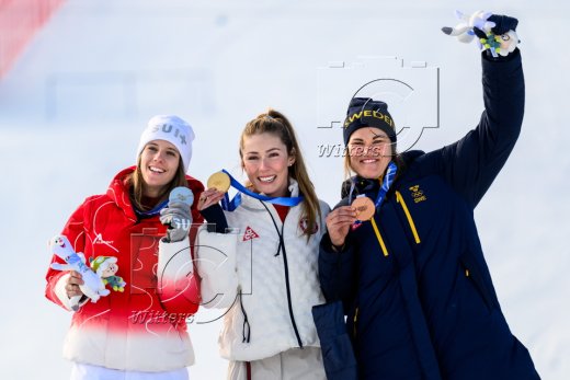 v.l. Camille Rast (Schweiz, Silber), Olympiasiegerin Mikaela Shiffrin (USA, Gold), Anna Swenn Larsson (Schweden, Bronze)