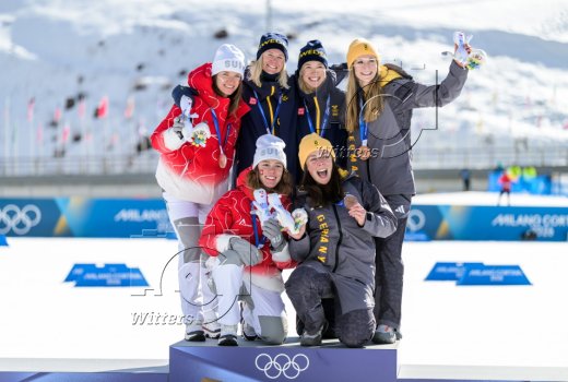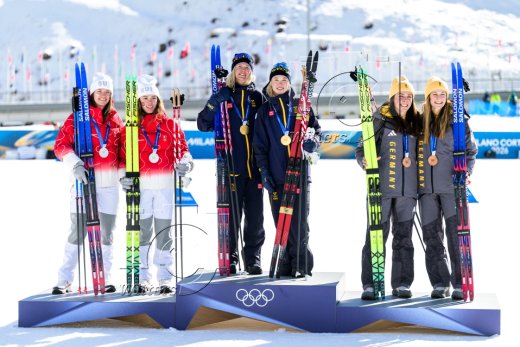 v.l. Nadja Kaelin und Nadine Faehndrich (Schweiz, Silber), Olympiasieger Jonna Sundling und Maja Dahlqvist (Schweden), Coletta Rydzek und Laura Gimmler (Deutschland, Bronze)
