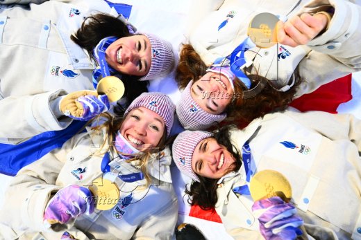 Olympiasieger Frankreich mit Oceane Michelon, Camille Bened, Lou Jeanmonnot und Julia Simon (im Uhrzeigersinn von links unten)