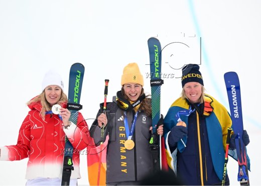 v.l. Sandra Naeslund (Schweden, Bronze), Olympiasiegerin Daniela Maier (Deutschland, Gold), Fanny Smith (Schweiz, Silber)