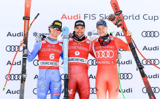 v.l. Giovanni Franzoni (Italien, 2. Platz), Sieger Vincent Kriechmayr (Oesterreich), Marco Odermatt (Schweiz, 3. Platz)