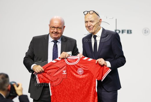 v.l. Jesper Moeller (Praesident Daenischer Fussballverband DBU, Daenemark), DFB-Praesident Bernd Neuendorf